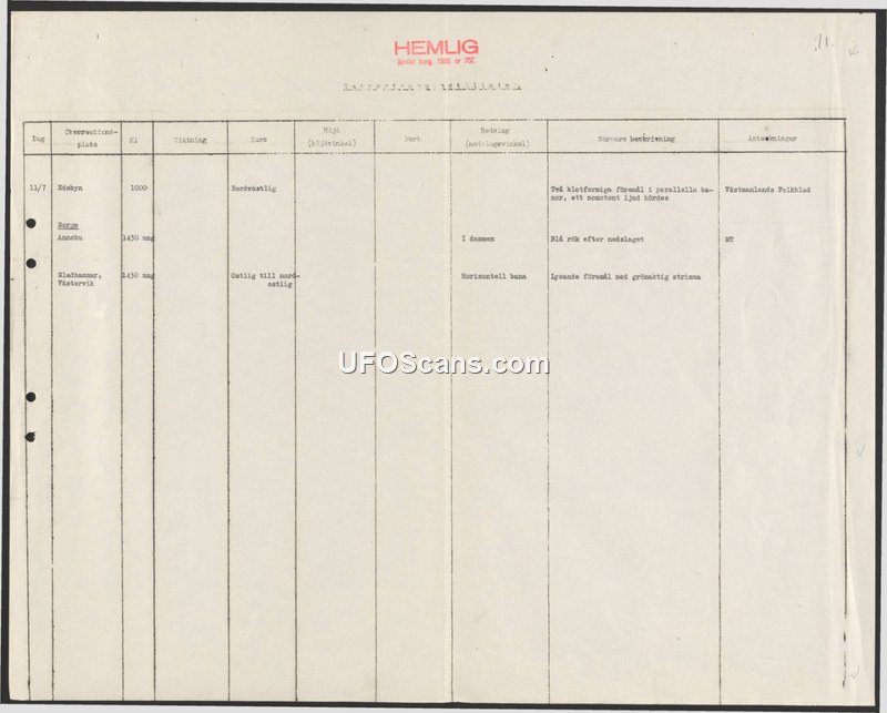 A classified Swedish report detailing three separate aerial sightings on July 11, including spherical objects, blue smoke, and a luminous object with a greenish streak.