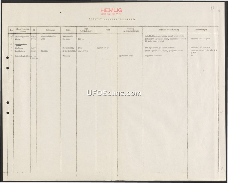 A classified Swedish military compilation of multiple aerial sighting reports from July 15th, describing various luminous and metallic objects observed by military personnel and civilians.