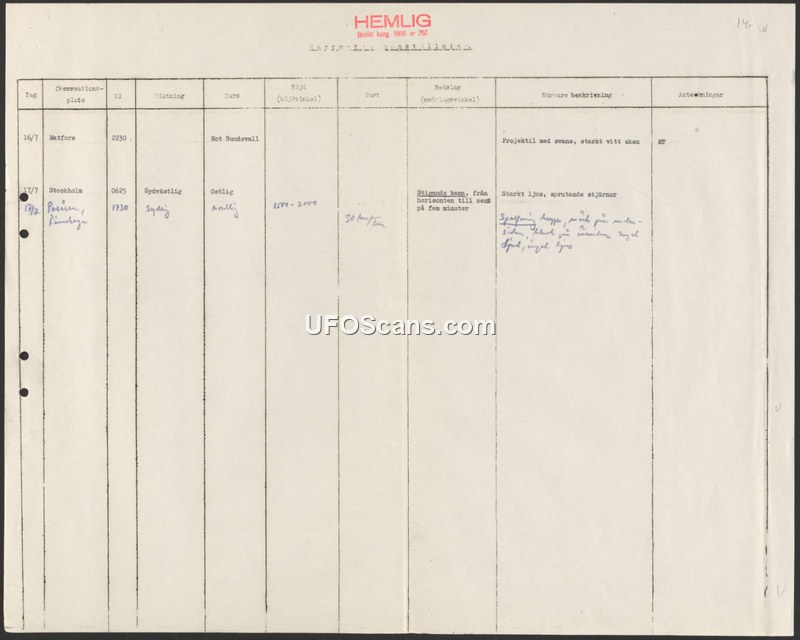 A classified Swedish report documenting two aerial sightings in July 1947, describing projectiles with tails and bright lights. The sightings occurred in Matfors and Stockholm.