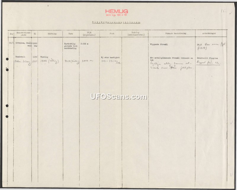A secret Swedish military report documenting two sightings of unidentified flying objects on July 18th in the Ortviken and Sundsvall areas. The objects were described as metal-shining and tube-like, with one report noting a potential connection to the FRA.