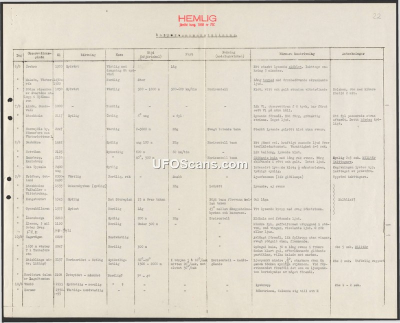 A secret Swedish military compilation of aerial sighting reports from August 1938. It documents multiple unidentified objects observed across various locations in Sweden.