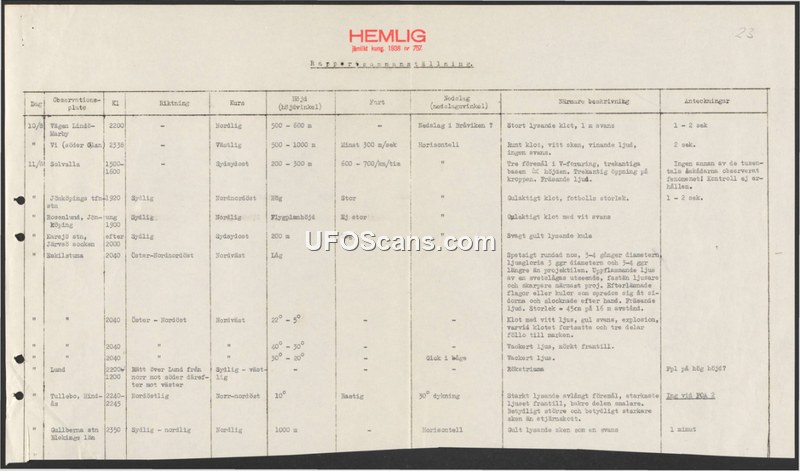 The document lists multiple sightings of aerial phenomena over Sweden, noting characteristics such as glowing spheres, trails, and specific flight behaviors. One entry notes that thousands of spectators observed a phenomenon, but control was not obtained.