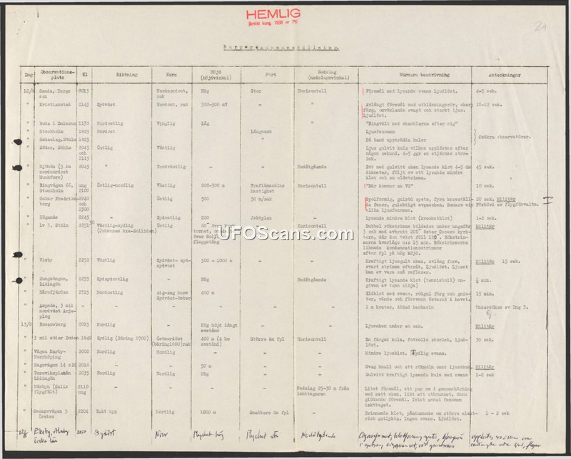 A classified Swedish military log documenting multiple aerial sightings over two days in August 1946. The reports describe various unidentified objects, some with physical traces and military interest.