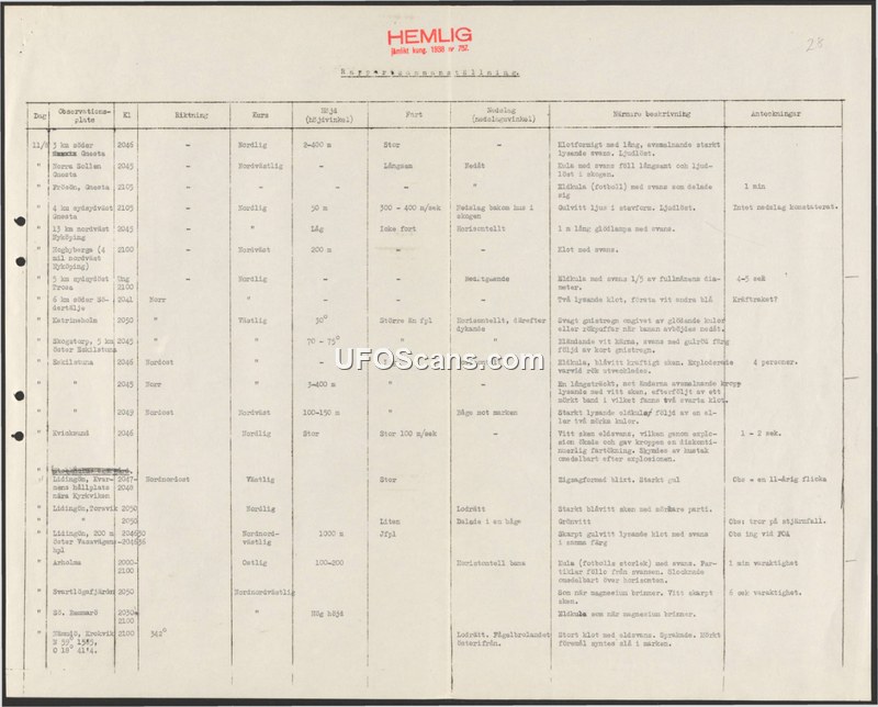A classified Swedish report compilation detailing multiple sightings of aerial phenomena, including fireballs and spheres, across various locations in Sweden. The document records flight characteristics, visual descriptions, and specific witness observations.