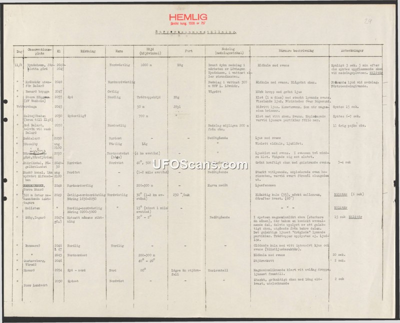 A 1938 Swedish military report documenting multiple sightings of aerial fireballs and glowing objects across various regions on August 11, 1938.