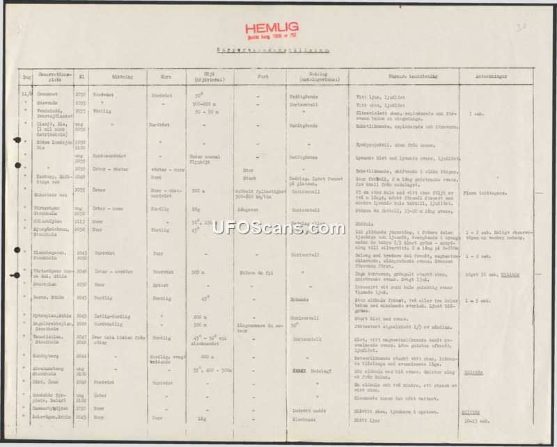 A 1938 Swedish secret document compiling multiple reports of unidentified aerial phenomena observed on August 11, 1938. It categorizes sightings by time, location, and physical characteristics of the objects observed.
