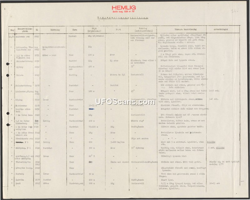 A classified Swedish military compilation log detailing multiple aerial sightings on August 11th, 1938. The reports describe various glowing, tailed objects observed across multiple locations, with some sightings involving military units.