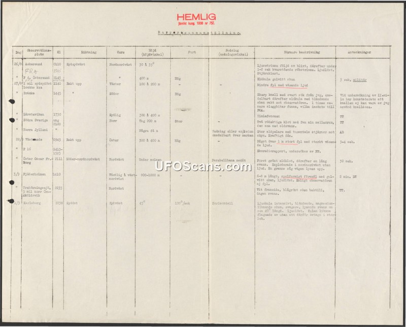 A classified Swedish military log documenting multiple aerial phenomena sightings in 1950. It includes reports of radar contacts and physical evidence, such as slag material, which were subject to official investigation.