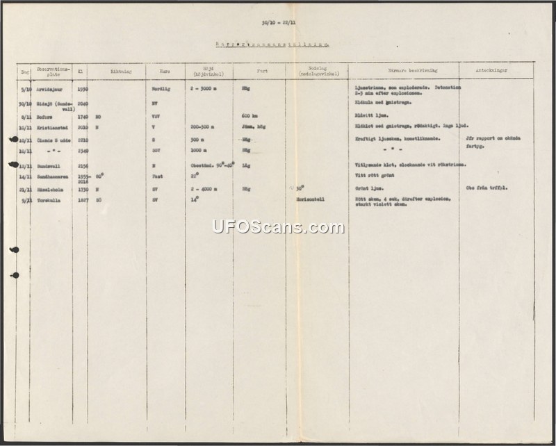 A Swedish military-style summary table documenting various aerial sightings and explosions between October 5 and November 9, 1950. The reports detail luminous phenomena, fireballs, and associated auditory events across multiple Swedish locations.