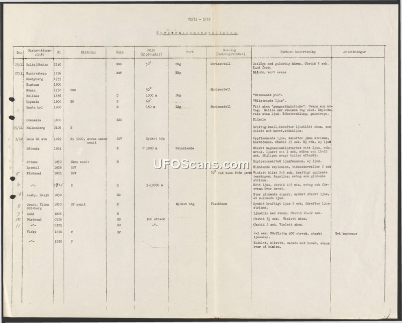 A chronological summary table of aerial sightings in Sweden from November 25 to December 3, detailing characteristics of various unidentified objects. It serves as a record of multiple independent reports, including one witnessed by two captains.