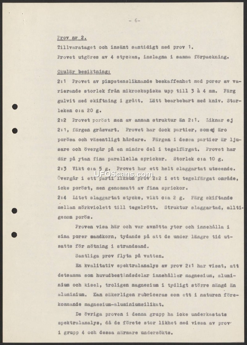 This document, page 6 of a larger report, details the laboratory examination of four physical samples (collectively referred to as 'prov 2') that were recovered at the same time as 'prov 1'. The samples were analyzed through visual inspection and, in the case of sample 2:1, qualitative spectral analysis. Sample 2:1 is described as a pumice-like material, yellow-white with gray tints, weighing approximately 20 grams, and containing pores ranging from microscopic to 3-4 mm. Sample 2:2 is gray-black, porous, and harder than 2:1, with some lighter and brick-colored sections and fine surface cracks. Sample 2:3 weighs approximately 5 grams and has a slag-like appearance, while sample 2:4 is a small 2-gram slag-like piece ranging from dark violet to brick red. All four samples share the characteristic of floating on water. The report notes that all samples exhibit worn surfaces and contain sand grains within their pores, indicating they were subjected to long-term abrasion in beach sand. Spectral analysis of sample 2:1 confirmed it consists primarily of magnesium, aluminum, and silicon, with a higher concentration of magnesium, leading to the conclusion that it is a naturally occurring magnesium-aluminum silicate. The other samples in this group were not analyzed spectrally because they were deemed highly similar to samples in group 4, which had already undergone closer examination.