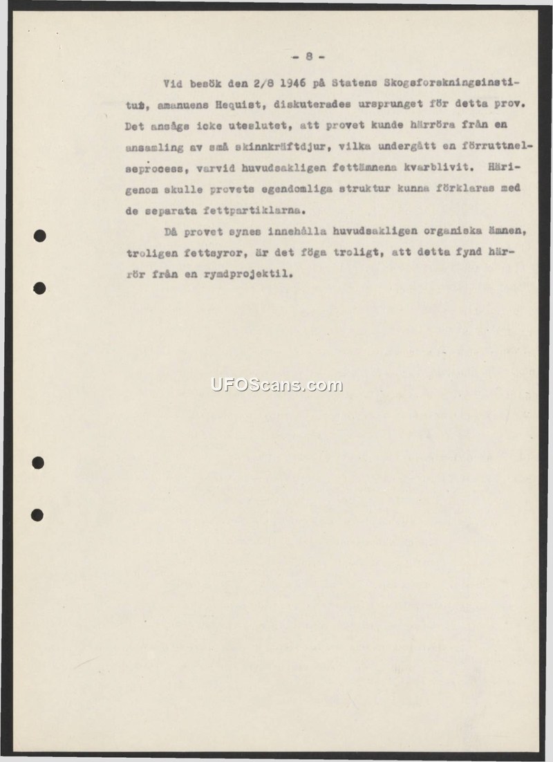 This document, dated August 2, 1946, records a consultation at the State Institute of Forest Research (Statens Skogsforskningsinstitut) regarding the origin of a specific specimen. During the visit, an amanuensis named Hequist discussed the nature of the material. The analysis concluded that it was not excluded that the specimen originated from a collection of small crustaceans that had undergone a decomposition process, leaving behind primarily fatty substances. The report suggests that the specimen's peculiar structure could be explained by these separate fat particles. Given that the material appears to consist mainly of organic substances, likely fatty acids, the report concludes that it is highly unlikely that the find originated from a space projectile.
