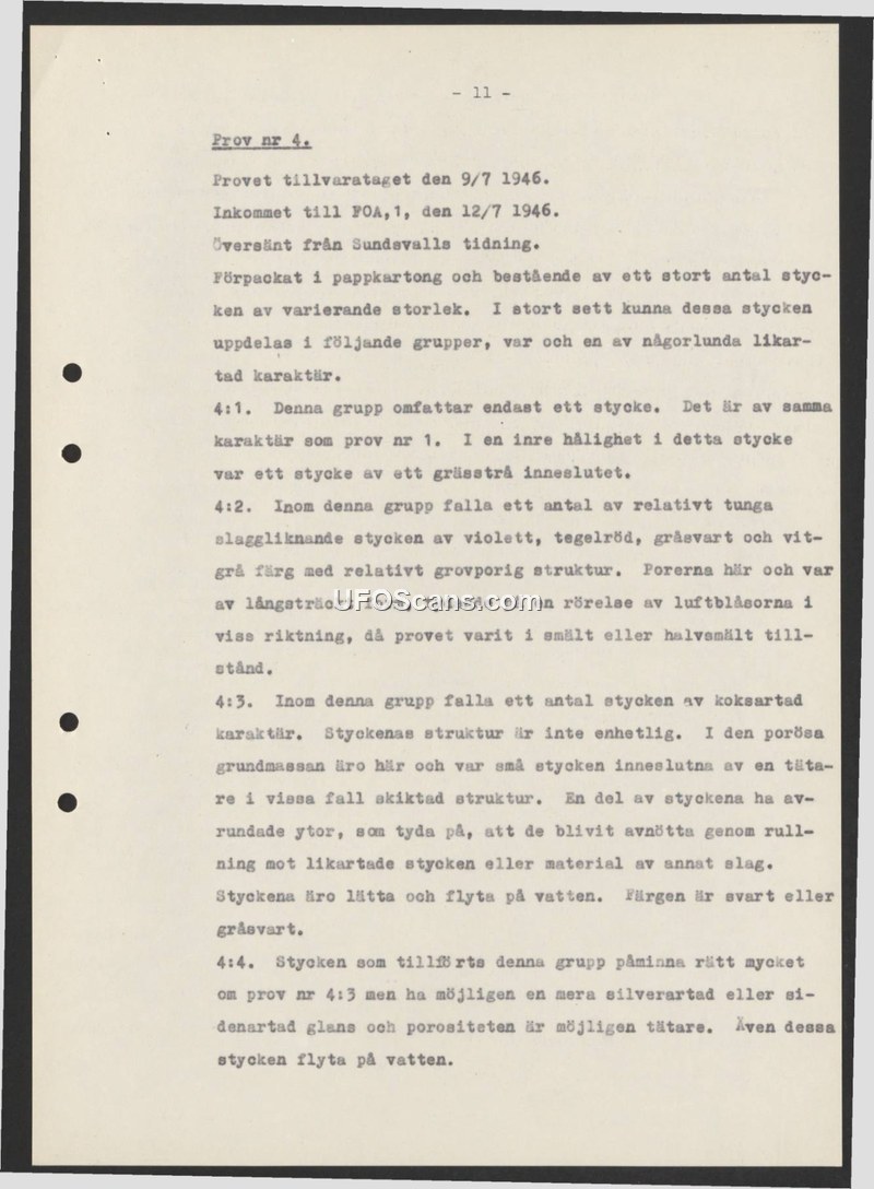 This document is a technical report from FOA,1 regarding the analysis of physical samples received on July 12, 1946, which had been collected on July 9, 1946, and forwarded by the newspaper Sundsvalls tidning. The material arrived in a cardboard box and consisted of numerous pieces of varying sizes. The report categorizes these pieces into four distinct groups based on their physical properties. Group 4:1 contains a single piece similar to 'sample no. 1', which notably contained a piece of grass inside an internal cavity. Group 4:2 consists of relatively heavy, slag-like pieces in colors including violet, brick red, and gray-black. These pieces exhibit a coarse-porous structure with elongated pores, suggesting they were once in a molten or semi-molten state where air bubbles moved in a specific direction. Group 4:3 contains coke-like pieces with a non-uniform structure; some are porous, while others are denser and layered. Some of these pieces have rounded surfaces, indicating they were worn down by rolling against similar materials. These pieces are light and float on water. Group 4:4 is similar to group 4:3 but possesses a more silver or tin-like luster and potentially higher density in its porosity. These pieces also float on water.