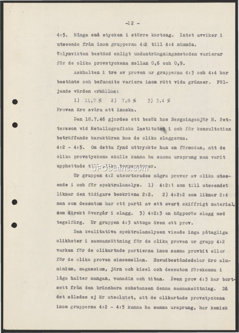 This document, page 12 of a larger report, details the technical analysis of material samples categorized as 4:2 through 4:5. The samples, described as small pieces in a larger box, were subjected to volume weight determination using the displacement method, yielding values between 0.6 and 0.9. Ash content analysis for samples 4:3 and 4:4 showed significant variation. On July 18, 1946, a consultation was held with Mining Engineer H. Pettersson at the Metallografiska Institutet to discuss the nature of the slag. Pettersson hypothesized that the samples might share a common origin but had been subjected to different heating temperatures. Further spectral analysis of group 4:2 samples—which included a piece resembling a previously described 2:2 sample, a piece with black shaly material, and a highly porous brick-colored slag—revealed no significant compositional differences. The primary constituents identified were aluminum, magnesium, iron, and silicon, with trace amounts of manganese, vanadium, and titanium. The report concludes that it is possible the diverse samples share a common origin.