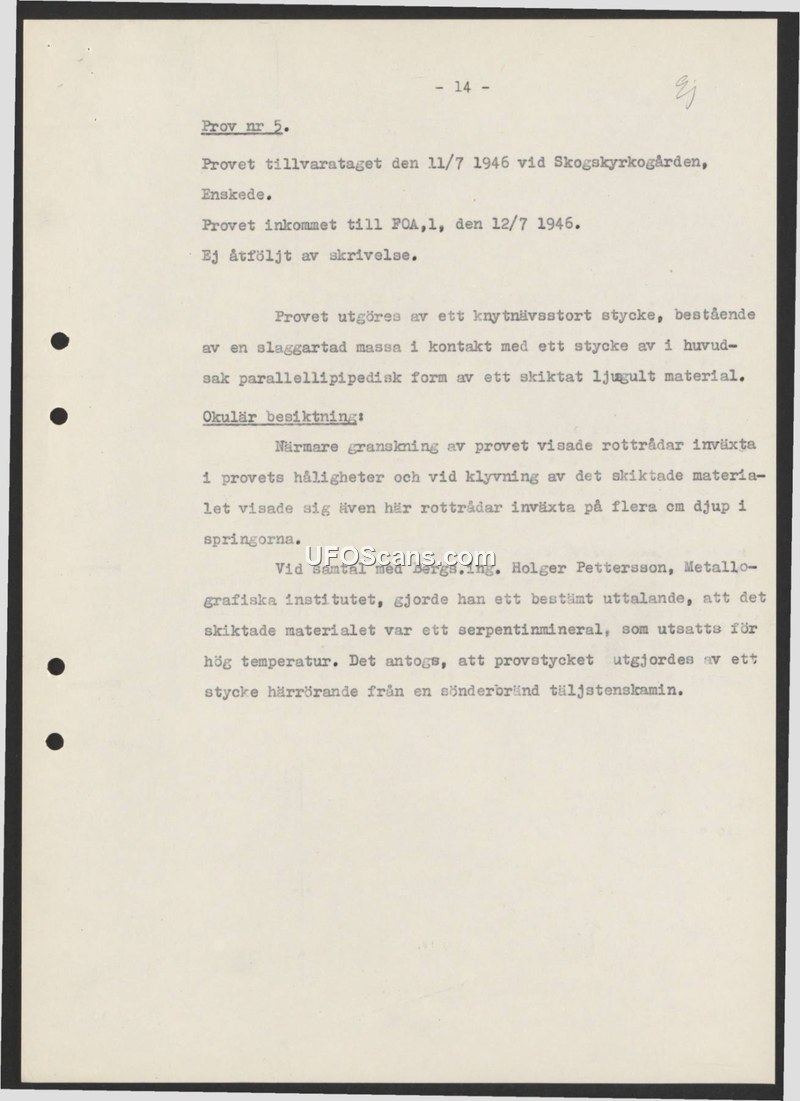 This document is a laboratory report regarding 'Specimen No. 5', which was collected on July 11, 1946, at Skogskyrkogården in Enskede, Sweden. The specimen was received by the FOA (Swedish Defence Research Agency) on July 12, 1946. The report notes that the item was not accompanied by any formal correspondence. Physically, the specimen is described as being the size of a fist, composed of a slag-like mass in contact with a layered material that is primarily parallelepiped in shape. Upon ocular inspection, it was discovered that root fibers had grown into the cavities of the specimen, and further investigation revealed these fibers had penetrated several centimeters deep into the fissures of the layered material. The FOA consulted with mining engineer Holger Pettersson of the Metallographic Institute. Pettersson provided a definitive statement that the layered material was a serpentine mineral that had been subjected to high temperatures. Based on this, it was concluded that the specimen likely originated from a destroyed soapstone stove.