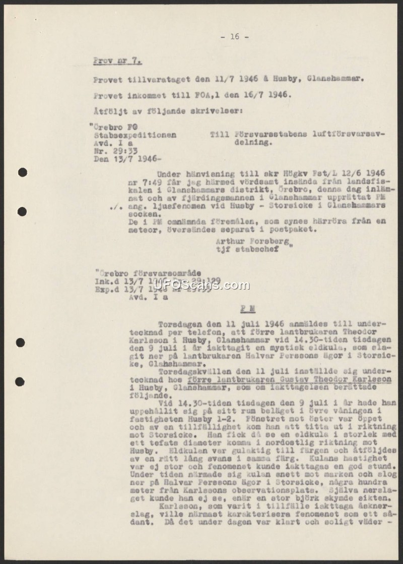 This document consists of a formal report and accompanying correspondence regarding an aerial sighting in Husby, Glanshammar, Sweden, on July 9, 1946. The report details an account provided by a former farmer, Gustav Theodor Karlsson, who observed a 'fireball' while looking out from his residence at approximately 14:30. Karlsson described the object as being roughly the size of a plate, yellowish in color, and accompanied by a long tail of the same hue. He noted that the object did not move quickly and was visible for a significant duration. The object appeared to descend obliquely toward the ground on the property of Halvar Persson in Storsicke, though the actual impact was obscured by a large birch tree. Karlsson, having previously witnessed lightning strikes, characterized the phenomenon as similar to one. The report was forwarded by the acting chief of staff of the Örebro Defense District to the Defense Staff's Air Defense Department on July 13, 1946, and was subsequently received by the FOA (Swedish Defense Research Agency) on July 16, 1946. The official correspondence suggests that the objects mentioned in the memorandum likely originated from a meteor.