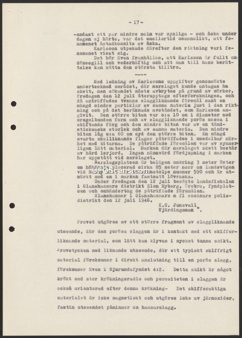 This field report, dated July 12, 1946, documents the investigation of an impact site near Husby, Sweden, conducted by Fjärdingsman K.G. Junevall. The investigation followed a report from a witness named Karlsson, who is described as highly credible. Upon searching the area, which was initially delayed by darkness, the investigator discovered two slag-like objects and a quantity of smaller particles at the location indicated by the witness. The larger object was approximately 10 cm in diameter with an irregular, porous shape, while the smaller piece was the size of a matchbox. Black, scale-like flakes were also found in the immediate vicinity. The ground at the site consisted of hard clay, and notably, there was no significant depression caused by the impact. The site was marked with a branch for identification. Landsfiskal Elon Nyberg of the Glanshammar district visited the site and took possession of the recovered items. The report concludes with a technical description of the material, noting that the porous slag is in contact with a shale-like substance that splits into thin layers. The material is non-magnetic and is not composed of iron oxides, though it bears a resemblance to hammer scale. The report mentions that similar material was previously documented in the Njurundafyndet 4:2 case.