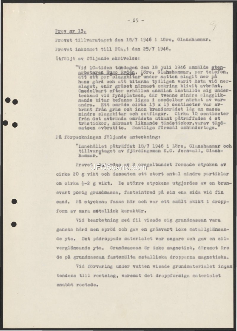 This document is a laboratory report from the Swedish National Defence Research Institute (FOA), dated July 25, 1946, concerning 'Sample No. 13'. The report details an incident reported by a stone worker named Hugo Rydén in Löre, Glanshammar, on July 18, 1946. Rydén reported that during the night, two slag-like objects fell onto his property. He claimed the objects were hot upon impact, as the grass surrounding the landing site was scorched. Upon investigation by Constable K.G. Jernwall, a 13x13 centimeter area of burned grass was identified, along with four match-like sticks. The laboratory analysis of the recovered material described two irregularly shaped pieces weighing approximately 20 grams, along with numerous smaller particles. The material was characterized as a brown-black, porous ground mass fused with sand on one side, featuring metallic, drop-shaped deposits. Physical testing revealed that the ground mass was hard but brittle, non-magnetic, and resistant to rusting in water. Conversely, the metallic droplets were magnetic and rusted rapidly when exposed to water.