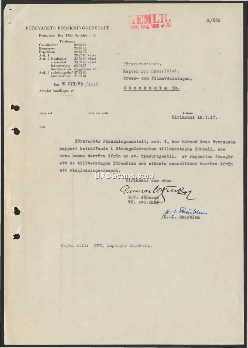 A 1947 Swedish military document identifies recovered objects from the Strängnäs area as a ring circuit element, dismissing initial suspicions that they were from a space projectile.