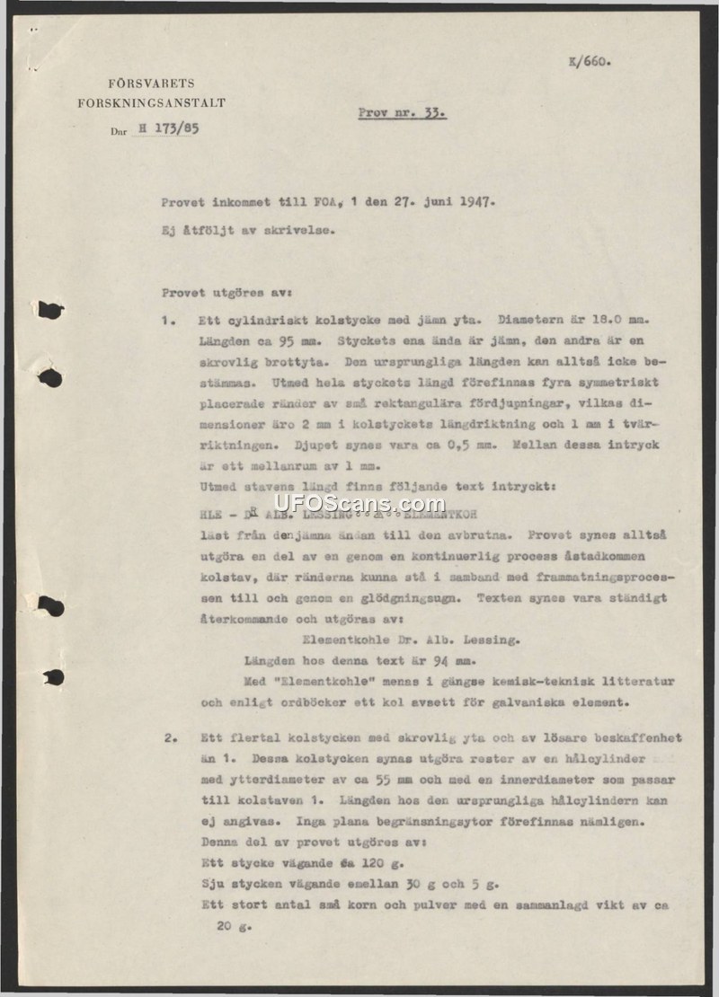 This document is a laboratory report from the Swedish National Defence Research Institute (FOA), dated June 27, 1947, regarding the analysis of physical samples designated as 'Prov nr. 33'. The report details two types of carbon materials received by the institute. The first sample is a cylindrical carbon rod, approximately 18 mm in diameter and 95 mm in length. It features a smooth surface with four symmetrical rows of small rectangular depressions, each 2 mm by 1 mm, with a depth of 0.5 mm. The rod bears an imprinted text: 'HLS - DR ALB. LESSING - ELEMENTKOHLE'. The report concludes that the rod is a product of a continuous manufacturing process, likely involving a feeding mechanism through an annealing furnace. The second set of samples consists of multiple pieces of carbon with a rougher surface, identified as remnants of a hollow cylinder with an outer diameter of approximately 55 mm, designed to fit the primary carbon rod. The report concludes that these items are carbon rods intended for use in galvanic elements, based on standard chemical-technical literature and dictionaries.