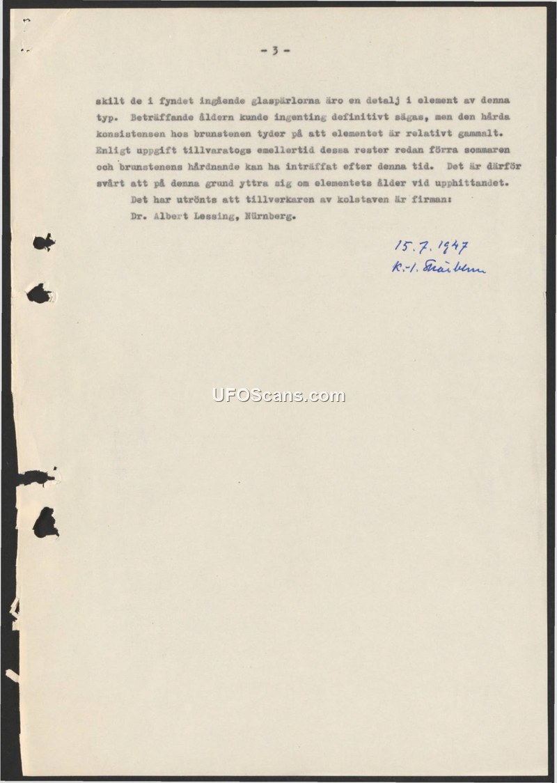 A technical report from July 1947 analyzing recovered components, including a carbon rod manufactured by Dr. Albert Lessing of Nuremberg. The report notes the difficulty in dating the object due to post-recovery hardening of materials.