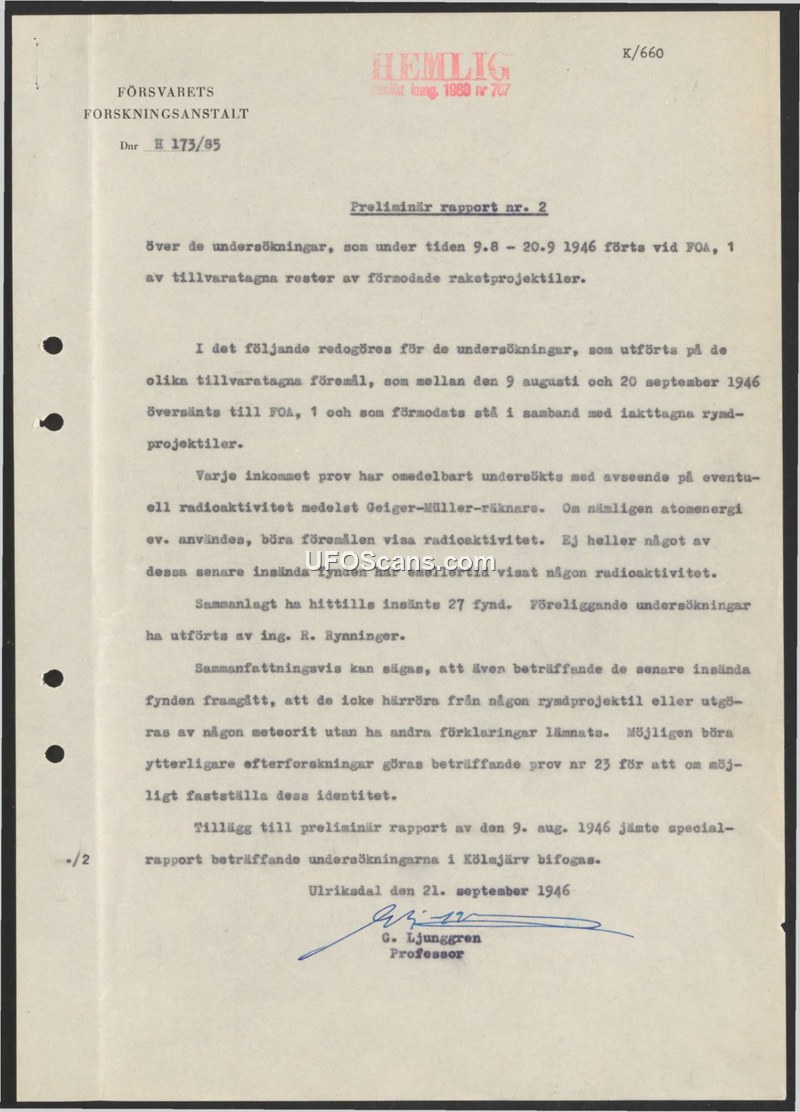 This document, dated September 21, 1946, is Preliminary Report No. 2 from the Swedish National Defence Research Institute (FOA). It details the investigations conducted between August 9 and September 20, 1946, regarding various objects recovered and sent to FOA 1, which were suspected to be related to observed space projectiles. A total of 27 items were submitted for analysis. Each item was immediately tested for radioactivity using a Geiger-Müller counter, as the presence of atomic energy would have been indicated by such activity; however, none of the items showed any signs of radioactivity. The investigations were carried out by Engineer R. Rynninger. The report concludes that the items do not originate from space projectiles or meteorites, and that other explanations have been provided for their existence. The author suggests that further research may be necessary regarding item number 23 to definitively establish its identity. The report also notes that a preliminary report from August 9, 1946, and a special report concerning investigations in Kölmjärv are attached.