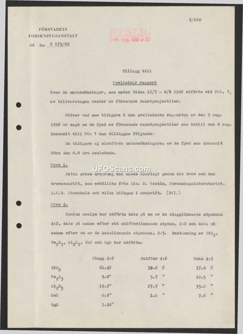 This document is an addendum to a preliminary report issued by the Swedish National Defence Research Institute (FOA 1) regarding the investigation of recovered remnants of suspected rocket projectiles. The report covers investigations conducted between July 12 and August 8, 1946. It serves to update a previous preliminary report dated August 9, 1946, concerning findings received by FOA 1 up to August 8. The document confirms that investigations into findings received prior to August 8 have been concluded. Specifically, it addresses two items: 'Prov 1' (Sample 1), the origin of which was clarified through correspondence with R. Westin of the Research Laboratory at L.K.B. Stockholm, and 'Prov 4' (Sample 4). For the latter, a chemical analysis was performed on slag-like pieces (4:2), ash from shale-like pieces (4:2), and ash from coke-like pieces (4:3). The document provides a table detailing the chemical composition of these samples, specifically measuring the percentages of SiO2, Fe2O3, Al2O3, CaO, and MgO.