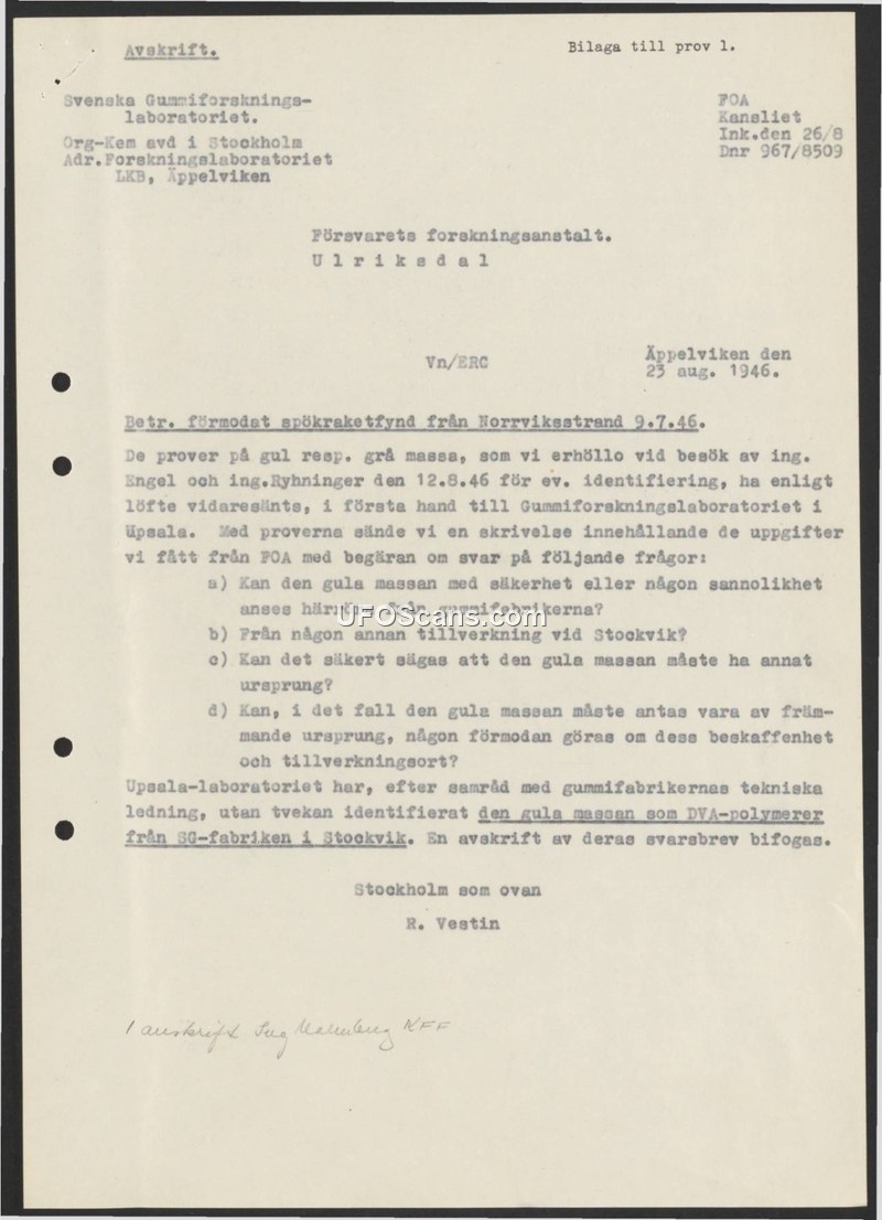 Regarding alleged ghost rocket find from Norrviksstrand 9.7.46