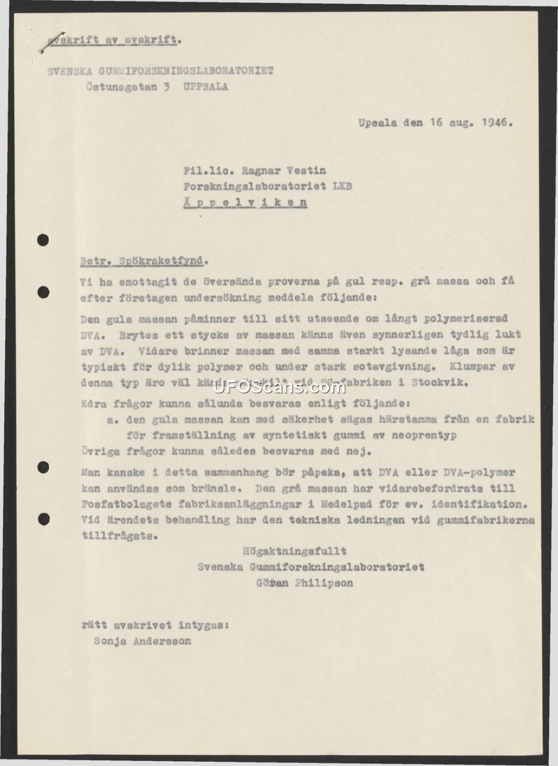 This document is a letter dated August 16, 1946, from the Swedish Rubber Research Laboratory (Svenska Gummiforskningslaboratoriet) in Uppsala to Ragnar Vestin at the LKB Research Laboratory in Äppelviken. The subject of the letter is the analysis of material samples related to 'ghost rocket' findings (Spökraketfynd). The laboratory examined two types of samples: a yellow mass and a gray mass. The yellow mass was identified as a highly polymerized DVA (a type of synthetic rubber, specifically neoprene), which is known to burn with a bright flame and heavy soot. The laboratory noted that such material is well-known at the factory in Stockvik. Regarding the gray mass, the laboratory could not identify it and stated it had been forwarded to the Fosfatbolaget factory in Medelpad for further analysis. The letter concludes by noting that DVA or DVA-polymer can be used as fuel and that the technical management of the rubber factories had been consulted during the investigation.