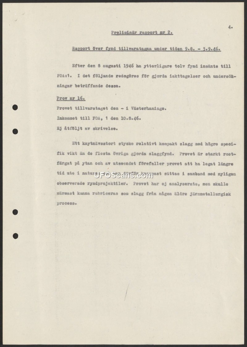 This report documents the analysis of a slag sample recovered in Västerhaninge in 1946. FOA investigators determined the object was likely industrial waste rather than related to contemporary aerial phenomena.