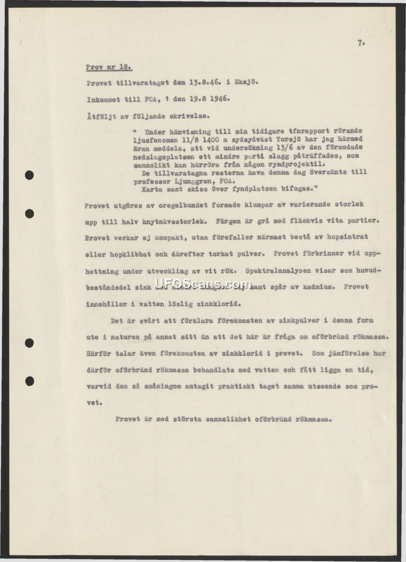 This document, dated August 19, 1946, details the laboratory analysis of 'Sample No. 18' (Prov nr 18) conducted by the FOA. The sample was recovered from a site near Torsjö, Eksjö, following a reported light phenomenon observed on August 11, 1946, at 1400 hours. An initial investigation on June 13 (likely a typo in the document for August) at the suspected impact site led to the discovery of slag material believed to be from a space projectile. The material was subsequently sent to Professor Ljundgren at the FOA for analysis. The physical description of the sample notes it consisted of irregularly shaped, grey lumps with white patches, reaching up to half the size of a fist. It was not compact, appearing to be composed of sintered or stuck-together dried powder. Upon heating, the material burned and produced white smoke. Chemical analysis revealed the primary component to be zinc, with trace amounts of lead and cadmium, as well as water-soluble zinc chloride. The report concludes that the presence of zinc powder in this form is difficult to explain in a natural context. By comparing the sample to known unburned smoke mass treated with water, investigators determined that the sample was, in all probability, unburned smoke mass.
