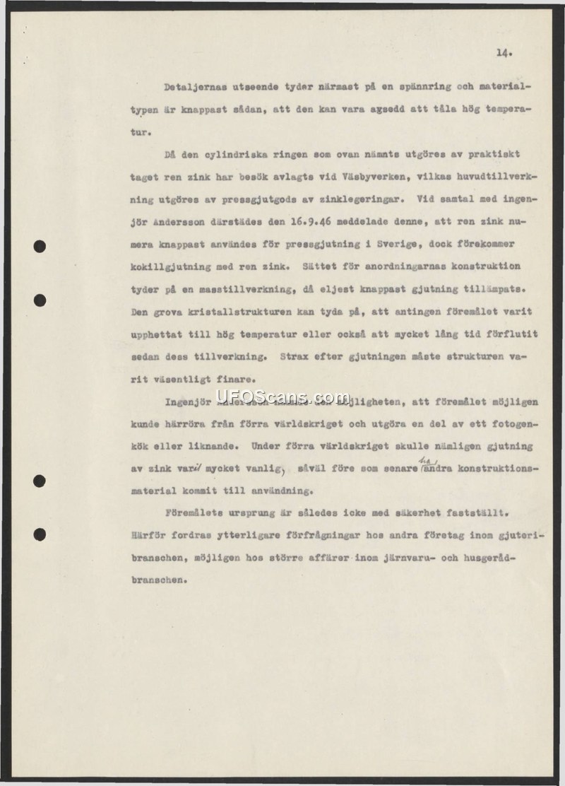 This document, marked as page 14, provides a technical assessment of a cylindrical ring made of nearly pure zinc. An investigation was conducted at Väsbyverken, a facility known for zinc alloy die-casting. On September 16, 1946, an engineer named Andersson was consulted regarding the material. Andersson stated that pure zinc is currently rarely used for die-casting in Sweden, although it is still used in some casting processes. The object's coarse crystal structure indicates that it was either subjected to high heat or that a significant amount of time has passed since its manufacture, as the structure would have been much finer immediately after casting. Andersson suggested the possibility that the object could date back to the First World War and might have been part of a kerosene stove or similar item, as zinc casting was common during that period. Ultimately, the origin of the object remains undetermined. The report concludes that further inquiries are required, specifically with other companies in the foundry industry or larger hardware and houseware retailers, to identify the object's source.