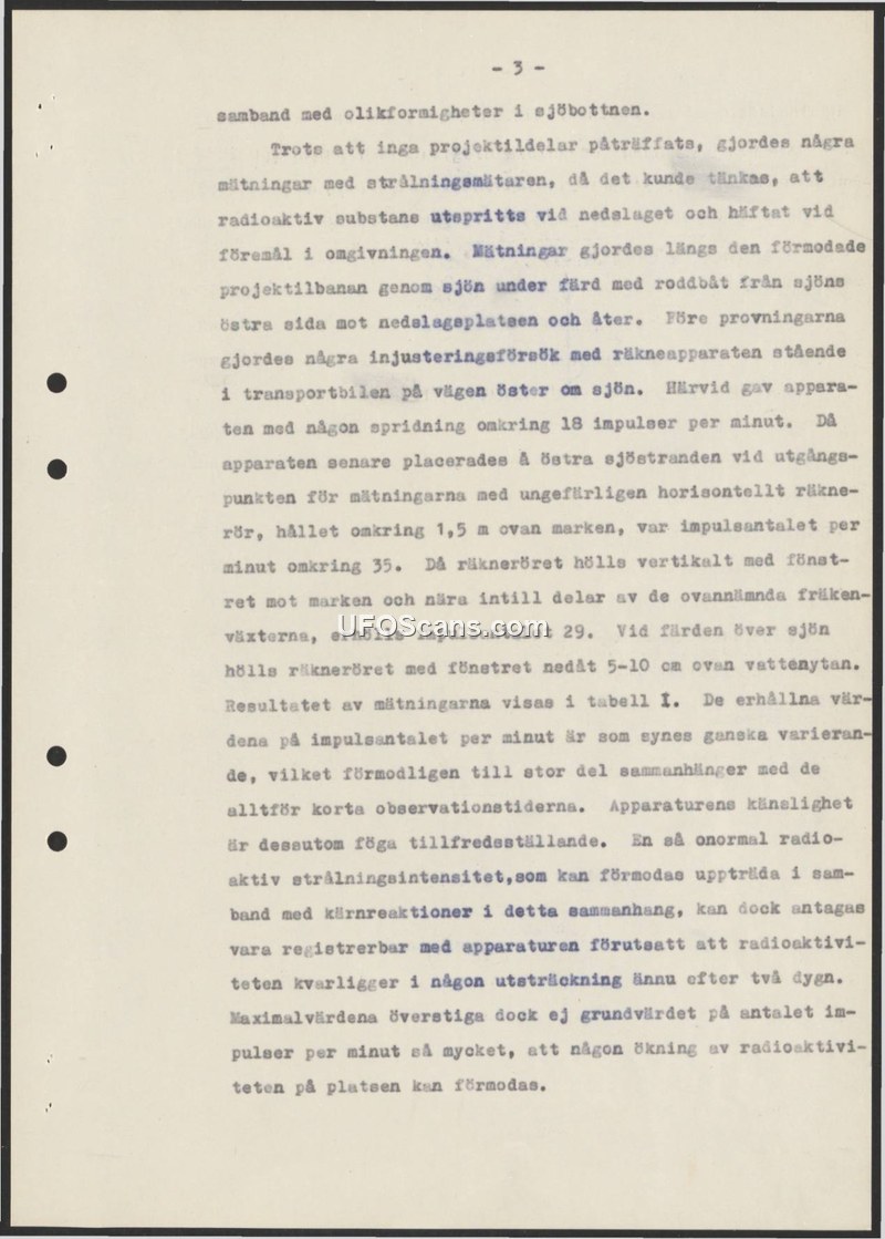 This document is a technical report detailing radiation measurements taken at a site where a projectile was suspected to have impacted. Although no physical parts of a projectile were recovered, investigators performed radiation surveys to determine if radioactive substances had been dispersed during the impact. The survey included measurements taken along the suspected flight path through a lake, using a rowboat, and measurements taken on the eastern shore of the lake. Initial calibration tests were performed in a transport vehicle, yielding approximately 18 pulses per minute. Subsequent measurements on the shore, with the counter tube held horizontally about 1.5 meters above the ground, showed approximately 35 pulses per minute. When the tube was held vertically near specific vegetation, the count was 29 pulses per minute. During the boat survey, the tube was held 5-10 cm above the water surface. The report concludes that the results, which are referenced in a 'Table I' not included in this excerpt, show variations likely due to the short observation times. The author expresses dissatisfaction with the sensitivity of the equipment, noting that while it might detect radiation from nuclear reactions, the current readings do not indicate any increase in radioactivity at the site above background levels.