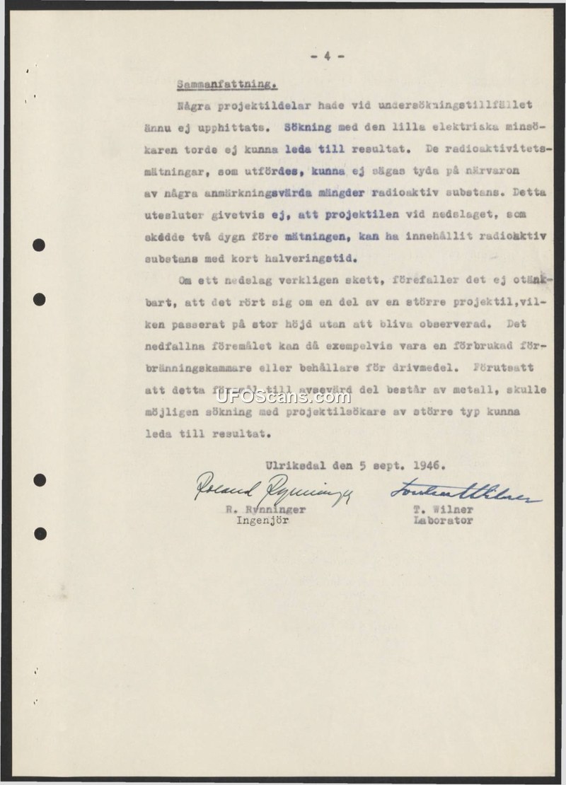 This document, dated September 5, 1946, from Ulriksdal, provides a summary of an investigation into a suspected projectile impact that allegedly occurred two days prior. The investigators, R. Rynninger and T. Wilner, report that they were unable to locate any parts of the projectile during their search. They utilized a small electric mine detector, which proved ineffective. Furthermore, measurements taken to detect radioactivity yielded no evidence of significant radioactive substances, although the authors caution that this does not definitively rule out the presence of radioactive material with a short half-life at the time of the impact. The report posits that if an impact did indeed occur, it is plausible that the object was a fragment of a larger projectile that had traveled at a high altitude without being previously observed. The authors speculate that the object could have been a spent combustion chamber or a fuel container. Given the hypothesis that the object is composed largely of metal, the investigators conclude that a search conducted with a larger, more capable type of projectile detector might be more successful in locating the object.