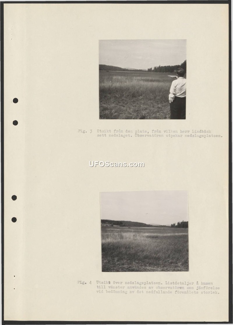 The document provides photographic evidence of an impact site in Sweden, featuring a witness named Mr. Lindbäck who used nearby houses to estimate the size of the object.