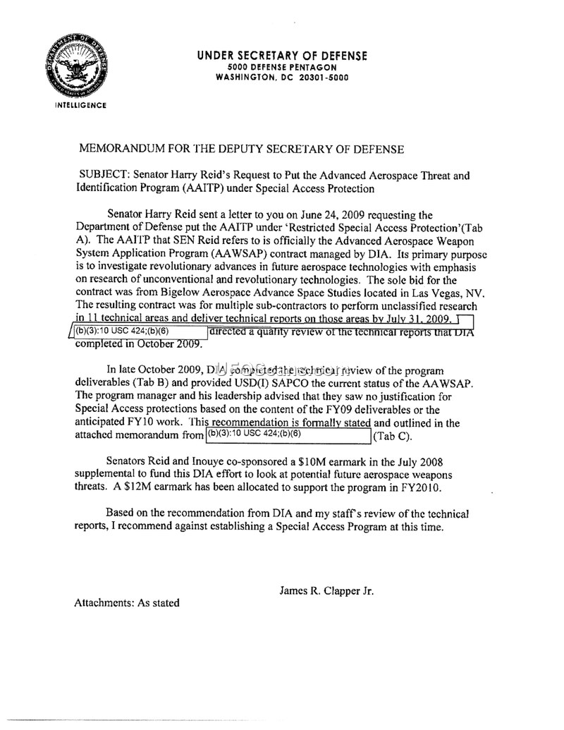 This collection of documents details the administrative and internal review process regarding a request by Senator Harry Reid to place the Advanced Aerospace Threat and Identification Program (AATIP), also referred to as the Advanced Aerospace Weapon System Application Program (AAWSAP), under a Restricted Special Access Program (SAP). In a letter dated June 24, 2009, Senator Reid requested this classification, arguing that the program's research into unconventional aerospace technologies and potential threats required extraordinary protection to prevent adversarial foreign intelligence services from gaining access to sensitive findings. The program, which was funded by a $10 million earmark in 2008 and a $12 million earmark in 2010, was contracted to Bigelow Aerospace Advance Space Studies (BAASS) to conduct research in 11 technical areas, including topics such as invisibility cloaking, warp drives, and antigravity. The Defense Intelligence Agency (DIA) conducted a technical review of the 26 reports produced by BAASS in 2009. The review concluded that the reports were academic and scientific in nature, and that the information contained within them did not warrant the high level of security associated with a Restricted SAP. The DIA noted that the research was unclassified and that there was no evidence of damage to national security if the information were disclosed. Consequently, James R. Clapper Jr. recommended against the request for SAP protection. The documents include talking points for a meeting between the Deputy Secretary of Defense and Senator Reid, as well as internal DIA memoranda outlining the rationale for denying the SAP request, emphasizing that the program's deliverables were consistent with unclassified scientific research.