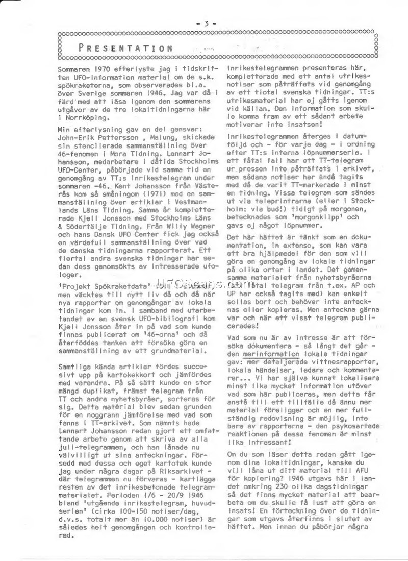 This document serves as an introduction to a compilation of data regarding the 'ghost rockets' (spökraketerna) observed over Sweden in the summer of 1946. The author describes the origins of the project, which began in 1970 following a public request for information. The project, referred to as 'Projekt Spökraketdata', involved the systematic collection and verification of newspaper reports from that period. Several individuals contributed to the effort, including John-Erik Pettersson, Lennart Johansson, Kent Johansson, Kjell Jonsson, and Willy Wegner of the Danish UFO Center. The methodology involved transcribing telegrams from the TT (Tidningarnas Telegrambyrå) archive, which were then cross-referenced with local newspaper reports to eliminate duplicates and identify unique accounts. The author notes that the period from June 1 to September 20, 1946, was thoroughly reviewed, covering over 10,000 notices. The resulting documentation is intended to assist researchers in further investigating local reports, including witness accounts and editorial commentary. The author emphasizes that while a significant amount of data has been collected, the project remains ongoing, and readers are encouraged to contribute additional material to the AFU (Archives for UFO Research) for further study. The document concludes by noting that the psychological reaction to these phenomena is considered as significant as the reports themselves.
