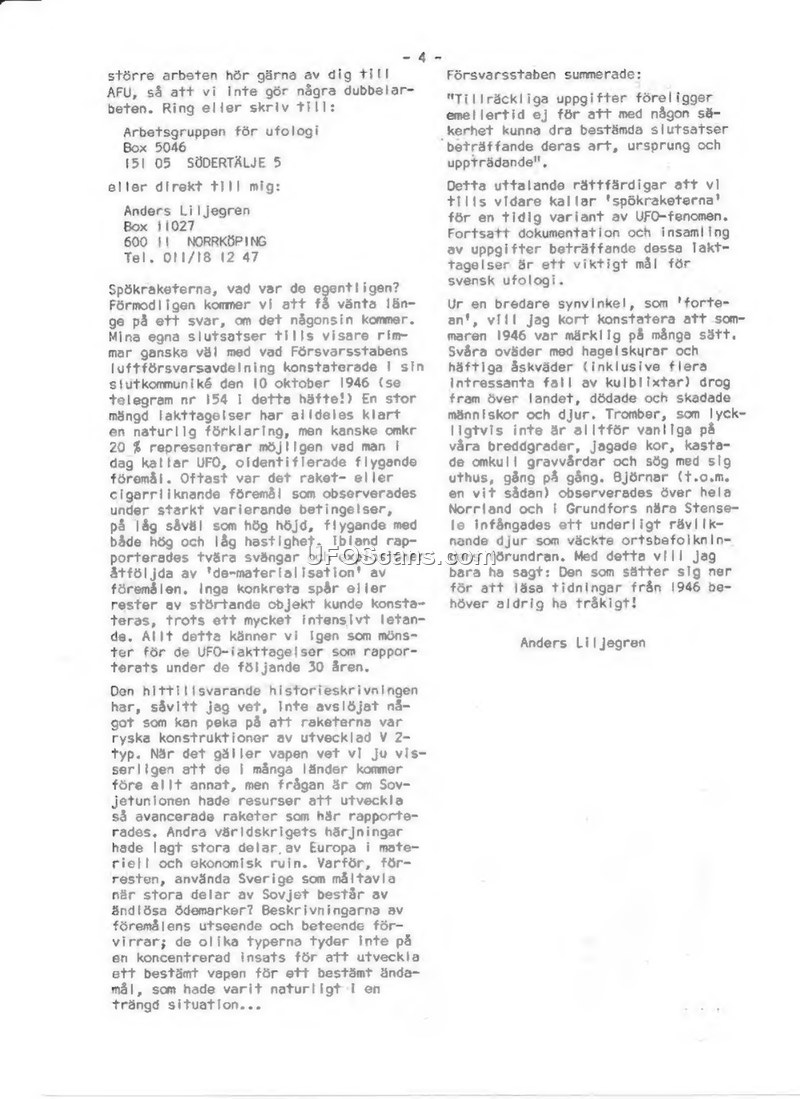 This document is a reflection by Anders Liljegren on the 1946 Swedish 'ghost rocket' sightings. It argues that the phenomena remain largely unexplained and advocates for continued systematic study.