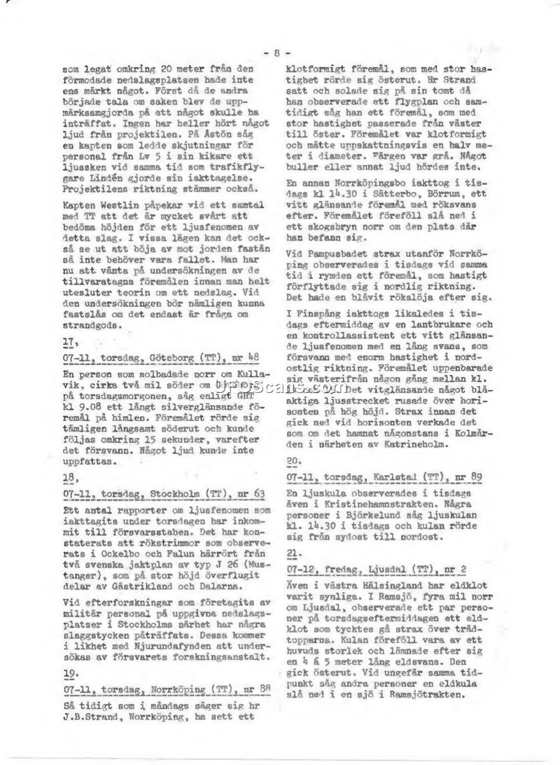 This document is a compilation of reports regarding various unidentified light phenomena and aerial objects observed across Sweden in November 1947. The reports, gathered by the news agency TT, detail multiple sightings by civilians and military personnel. Descriptions of the objects vary, ranging from silver-shining, long objects to spherical, gray objects, often accompanied by smoke trails or light tails. Some witnesses reported the objects moving at high speeds, while others described slower movement. Notably, a captain from the Lv 5 unit observed a light phenomenon at the same time as a pilot named Lindén. The document notes that while some reports of smoke trails in Ockelbo and Falun were officially attributed to Swedish J 26 (Mustang) fighter aircraft, other incidents, including the discovery of slag pieces near Stockholm, were slated for investigation by the Defense Research Institute (Försvarets forskningsanstalt) to determine their nature. The document highlights the difficulty in estimating the altitude of these phenomena and cautions against premature conclusions regarding potential impacts or crashes, suggesting that some findings might simply be beachcombed debris.