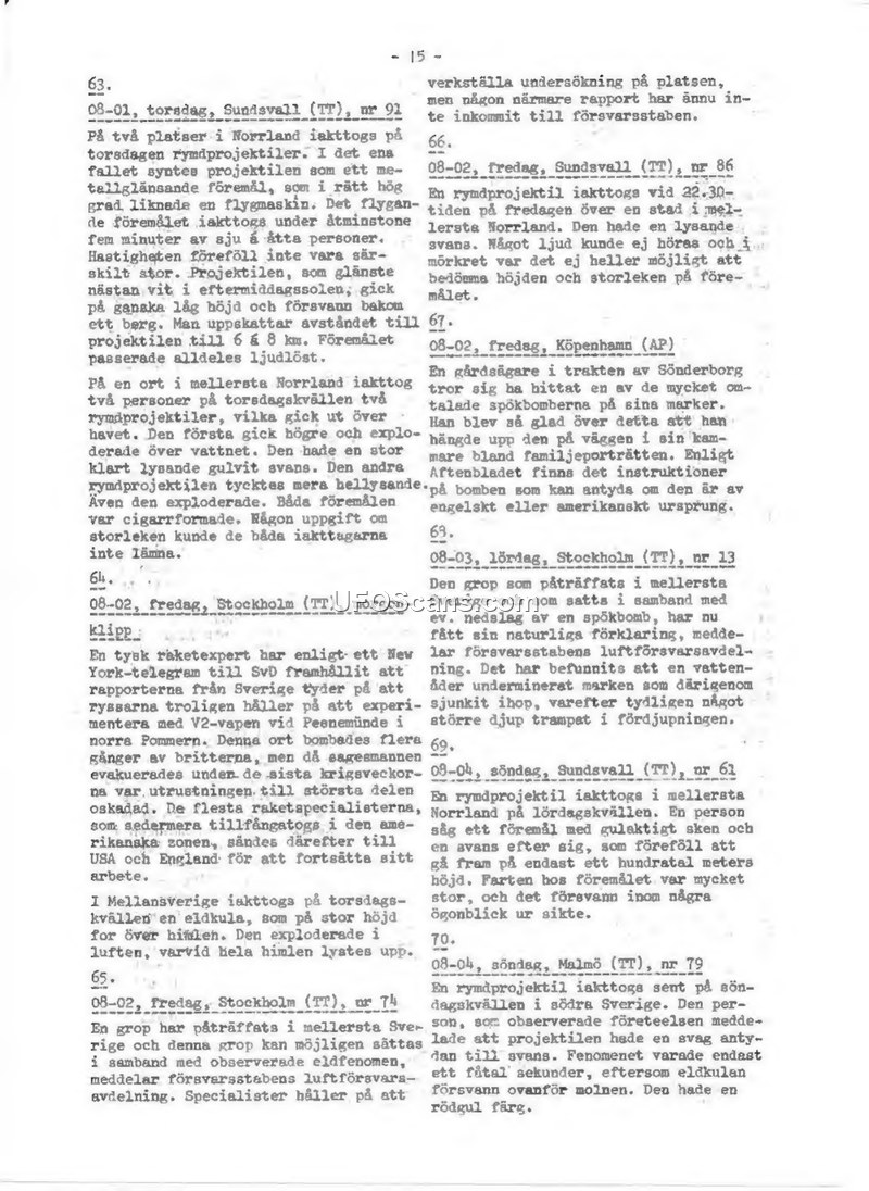 A collection of Swedish press reports from August 1946 documenting sightings of unidentified aerial objects and the Swedish military's investigation into them. The military concluded that at least one reported impact site was a natural geological event.