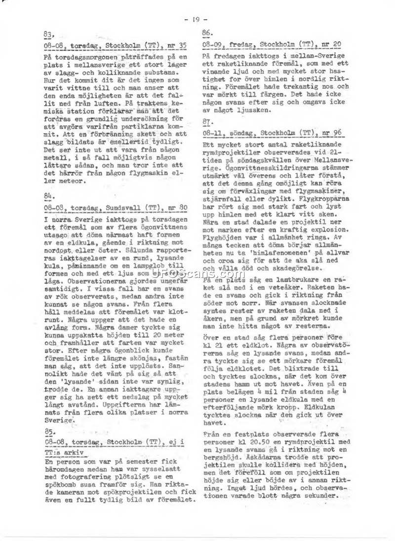 This document is a compilation of press reports from the Swedish news agency TT, detailing a series of sightings of unidentified aerial phenomena across Sweden between August 8 and August 11, 1947. The reports describe a variety of objects, including fireballs, rocket-like projectiles, and glowing spheres. One report from August 8 mentions the discovery of a large deposit of slag and coal-like material in central Sweden, which authorities suspected might have fallen from the sky, though they could not confirm its origin. Another report describes a vacationer who claimed to have photographed a 'ghost bomb' (spökbomb). By August 11, the reports indicate a significant increase in sightings of 'rocket-like space projectiles' over central Sweden. Witnesses described these objects as moving at high speeds, emitting a clear white light, and in some cases, producing a whining sound or causing explosions upon descent. The document notes that the public was becoming increasingly concerned about the potential for these phenomena to cause death or property damage. The reports emphasize that the sightings were distinct from conventional aircraft or meteors, and in one instance, a witness observed a rocket-like object landing in a wheat field, though no remains were found in the dark.