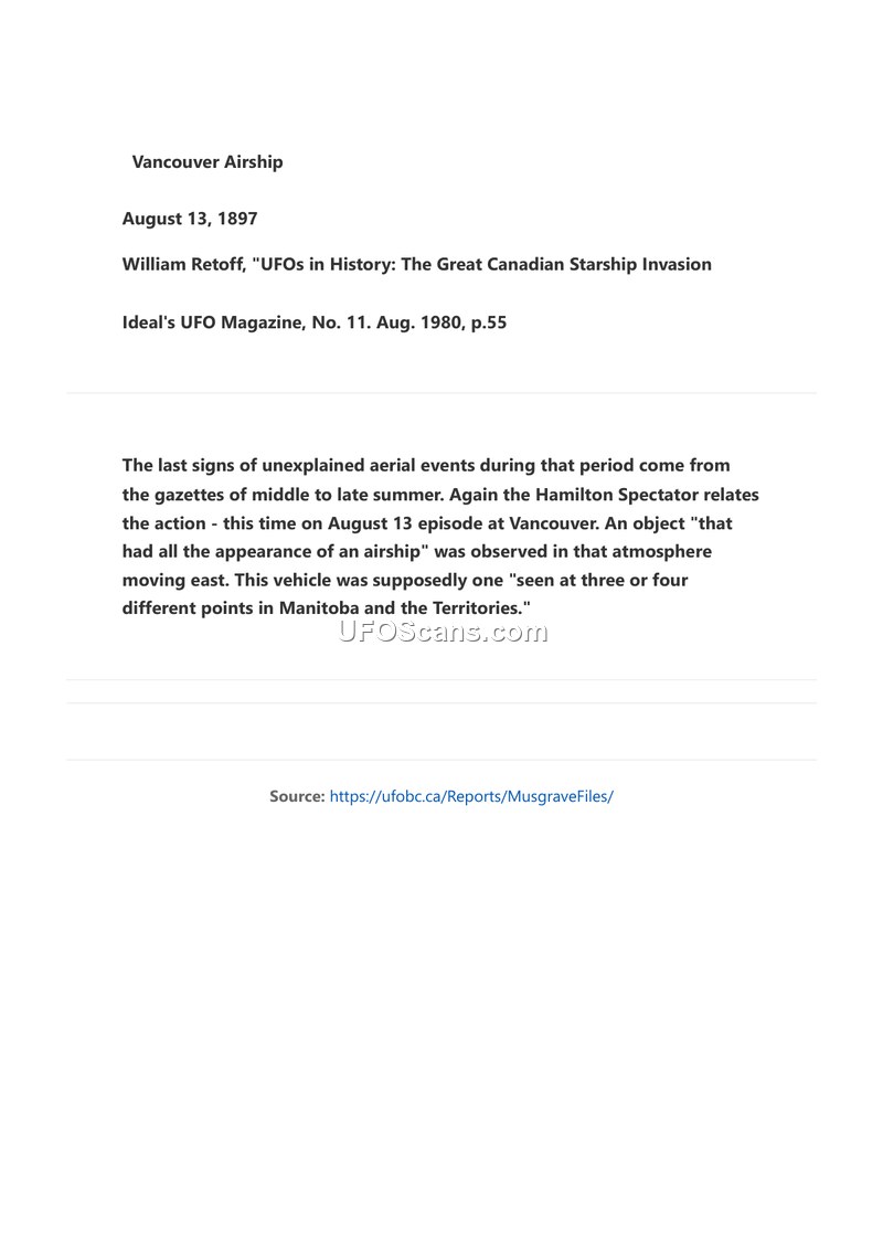 This document summarizes a historical 1897 sighting of an airship-like object in Vancouver, as reported by the Hamilton Spectator. It serves as a reference for unexplained aerial events in late 19th-century Canada.