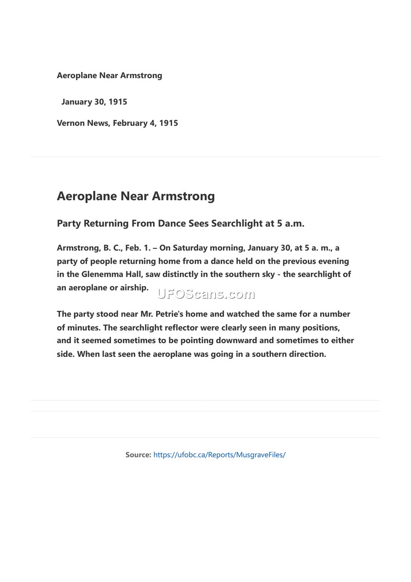 On the morning of January 30, 1915, a group of individuals returning from a dance at Glenemma Hall in Armstrong, British Columbia, observed an unidentified aerial object. At approximately 5:00 a.m., the party, while standing near the residence of a Mr. Petrie, witnessed a searchlight associated with what they described as an aeroplane or airship. The observers watched the object for several minutes, noting that the searchlight reflector moved into various positions, occasionally pointing downward or to the sides. The object was last observed traveling in a southern direction. This account was subsequently reported in the February 4, 1915, edition of the Vernon News.