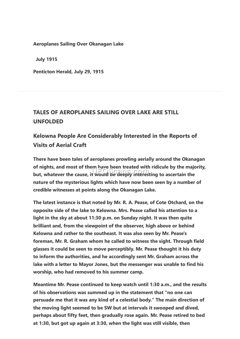 This article from the July 29, 1915, edition of the Penticton Herald reports on persistent sightings of mysterious aerial craft over Okanagan Lake. Despite public ridicule, several credible witnesses reported seeing brilliant lights in the night sky. The primary account provided is that of Mr. R. A. Pease of Cote Otchard. On a Sunday night in July 1915, at approximately 11:30 p.m., Mr. Pease and his foreman, Mr. R. Graham, observed a brilliant light in the sky, positioned high above or behind Kelowna to the southeast. Using field glasses, they observed the object moving perceptibly. Mr. Pease attempted to notify Mayor Jones, but the mayor was away at his summer camp. Mr. Pease continued his observations until 1:30 a.m., noting that the object moved generally in a southwest direction, occasionally swooping and diving approximately fifty feet before rising again. He explicitly rejected the possibility that the object was a celestial body. Upon checking again at 3:30 a.m., the light remained visible, eventually appearing over the Westbank Indian reserve. Mr. Pease reported hearing a distinct buzzing noise, consistent with an aerial motor or propeller. By 5:30 a.m., the light was no longer visible. The article concludes by noting that the mystery remains unsolved.