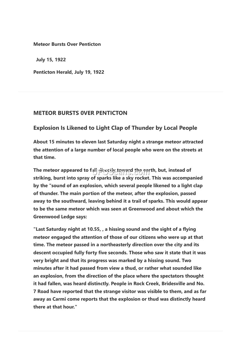 A meteor was observed over several British Columbia towns on July 15, 1922, accompanied by a hissing sound and a loud explosion. The event was documented by local newspapers including the Penticton Herald and the Greenwood Ledge.