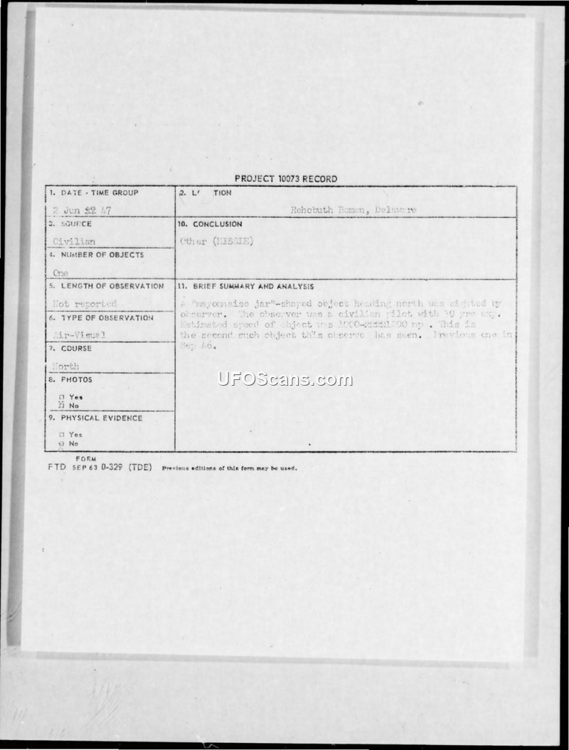 This document contains a Project 10073 record regarding a sighting on 2 June 1947 at Rehoboth Beach, Delaware. The witness, a civilian pilot with 30 years of experience, reported observing a single 'mayonnaise jar'-shaped object traveling north at an estimated speed of 1000-1200 mph. The report notes that this was the second such object the observer had seen, with a previous sighting occurring in September 1946. The document includes an evaluation stating that the incident contains nothing astronomical. The investigator suggests that the objects observed on three separate dates were likely 'Bumble bees,' which are identified as ram-jet missiles fired from Fort Miles by the Applied Physics Laboratory of Johns Hopkins University. The investigator notes that because the exact time of the observations and the specific dates of the first two sightings were not provided in the submitted material, a definitive identification could not be confirmed. However, the report suggests that further inquiry at the Applied Physics Laboratory, located at 8621 South Georgia Avenue, Silver Spring, Maryland, might yield a positive identification. Additionally, the document includes an index of incidents extracted from a Project Grudge report, categorized by Dr. Hynek into astronomical, non-astronomical (suggestive of other explanations), and non-astronomical (no explanation evident) categories.
