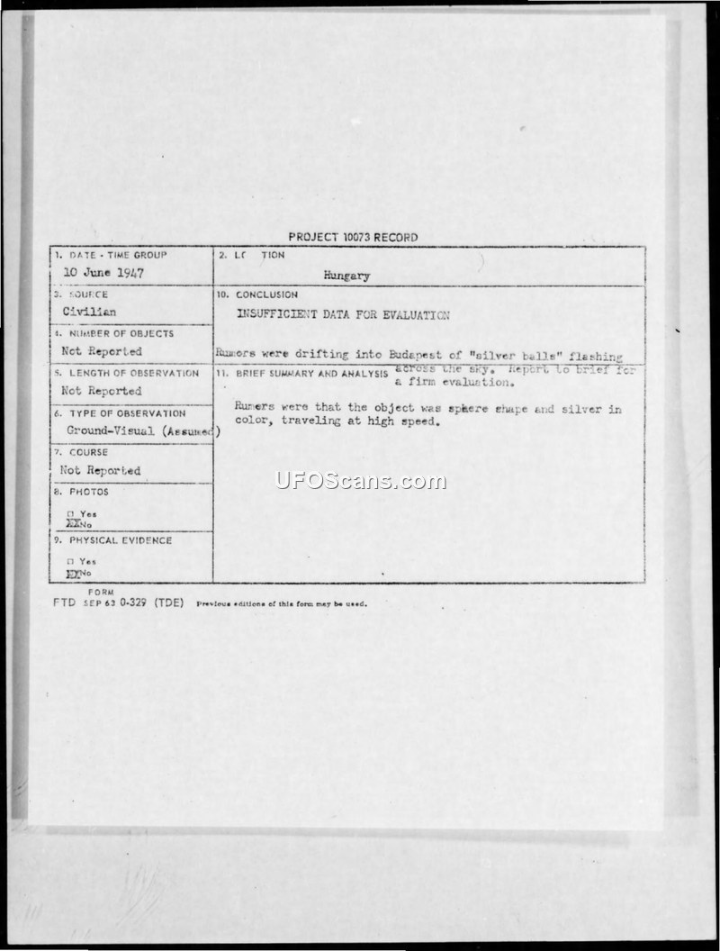 Project 10073 Record: Incident #38, Hungary, 10 June 1947
