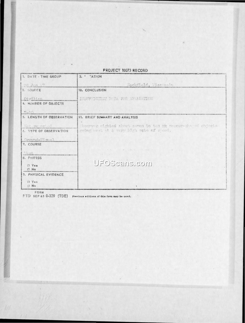 A 1947 sighting report of seven to ten saucer-shaped objects near Rockfield, Wisconsin, was deemed insufficient for evaluation by project investigators. The report highlights the influence of contemporary media on witness accounts during the period.
