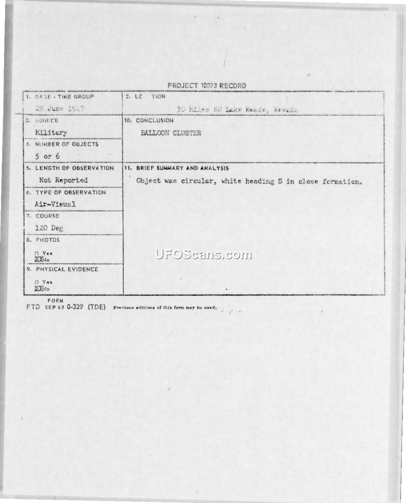 A 1947 sighting of 5-6 circular objects near Lake Meade, Nevada, by a military pilot. The incident was officially concluded to be a cluster of balloons, likely cosmic ray apparatus, based on an analysis of the pilot's flight path.