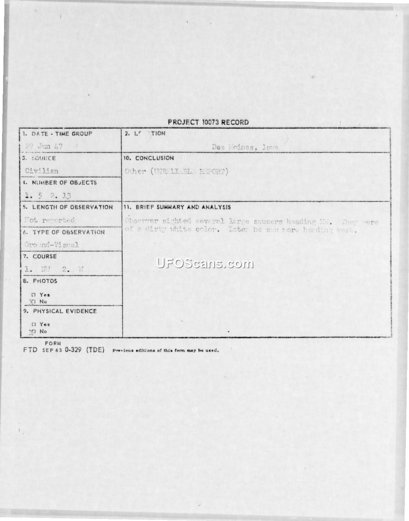A civilian in Des Moines, Iowa, reported seeing five large, dirty-white saucer-shaped objects on June 29, 1947. The report was officially classified as an unreliable report by Project 10073.